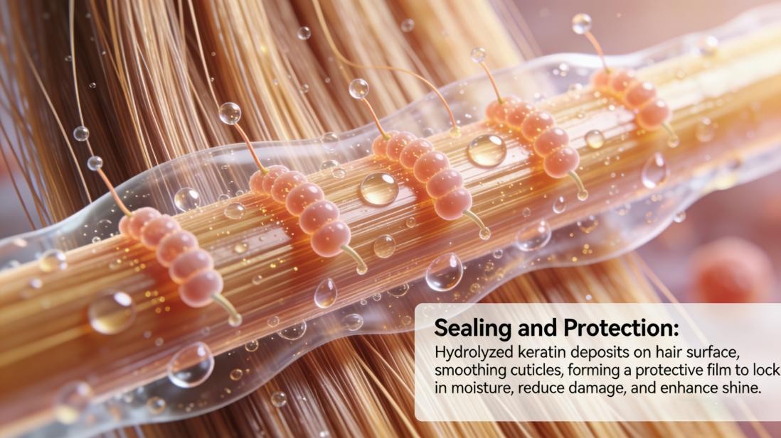 Active amino acids (especially cysteine) in hydrolyzed keratin bind to the remaining protein structures in the hair, reforming a cross-linked network and strengthening the hair's internal structure.