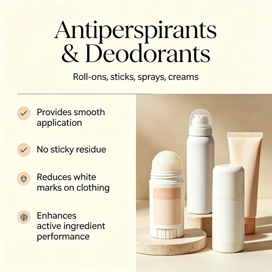 Formulators can use SQ‑SIL V5 with confidence in skincare, hair care, color cosmetics, sun care, antiperspirants, and deodorants.